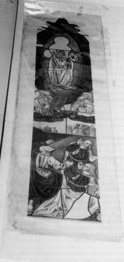 The object to be flattened was one tightly rolled bundle of papers containing tracings of medieval stained glass windows from Fairford Church, Gloucestershire. The Reverend Joyce had traced out the pattern of the windows in 1871 and given them to the Museum in January 1874. The tracings were understood to be painted, of dimensions 245 to 365cm in length by 68cm wide. The information contained in the roll was required by a stained glass craftsman to assist him in the restoration of windows at the church.