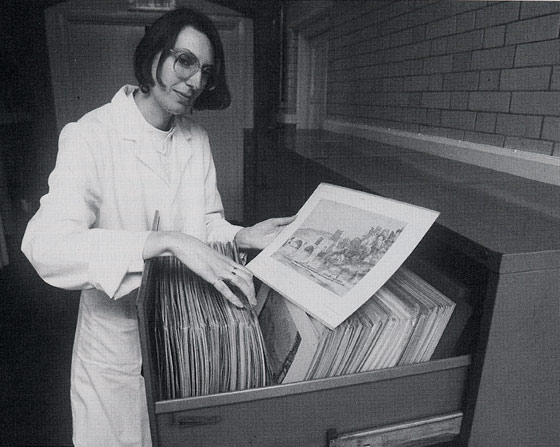 This first part of the collection numbered 11,291 objects of which 8,718 are photographs and 2,573 are photomechanical prints. It includes reproductions of oil paintings, watercolours, drawings, textiles, frescoes, prints and a number of letters and verses. Some of the images contain accompanying inscriptions by the artist. The majority of the objects cite the name of the artist, the date and country, the title and sometimes the subject of the work of art, and the collection it came from. The objects are stored vertically, landscape, in metal filing cabinets of three or four drawers.