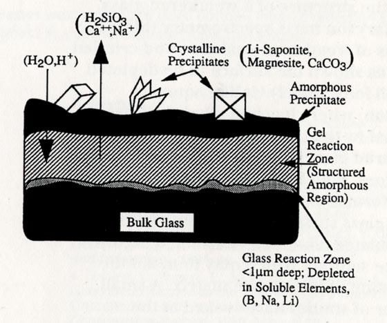 Fig. 1. Schematic diagram of the structure of a weathered glass surface. Reproduced with permission of Noyes Publications. (click image for larger version)