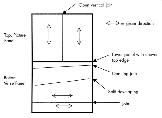 The join between the image panel and the verse panel did not appear to be original since the upper part of the letters of the top line were missing, suggesting it had been planed down.