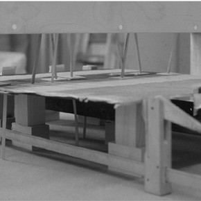 The panels were then placed in a humidity chamber at 54% RH1 for three weeks to allow them to adjust to ideal environmental conditions. Once stable, the panels' shape would be maintained by framing them in a microclimate of the same conditions. To glue the panels back together a 're-joining' jig was constructed2 (Figure 2). This consisted of a wooden bridge that spanned the join or split that required re-gluing. The panel rested on a series of blocks keeping it equidistant from both the table and the 'jig bridge'.