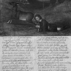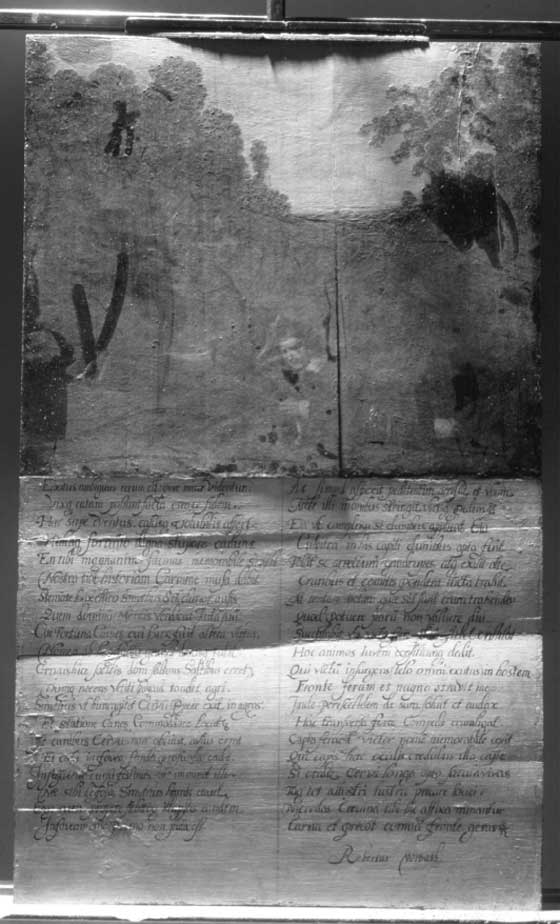 In 1945 the Museum acquired an unusual English, 17th Century oak panel painting (W19 -1945) from Hill Hall in Essex. The painting consists of two parts: a picture panel depicting a man grasping onto the hind legs of a stag; and a panel with twenty lines of verse describing the event,( Figure 1). It tells the tale of Colonel Sir William Smith (1550-1626) of Hill Hall and how he gained a reputation for bravery when he chased a stag, which had strayed into his grounds. As the stag attempted to escape its hunter, it fell into a pit and so did the hapless Colonel Smith. Seizing his opportunity, Colonel Smith grabbed hold of the stag's hind legs and as it leapt from the pit, he held on and was dragged out too. Being unarmed, he beat the animal with his fists and tied it up with his garter. And so the story was committed into verse by Robert Wroath, a poet and neighbour of the brave Colonel.