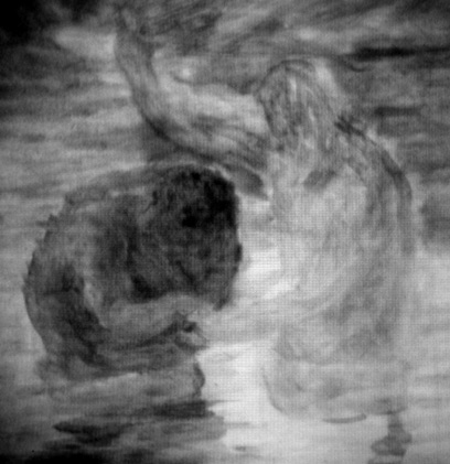 Figure 3. Infrared refelectography detail of John Linnell, Halt by the Jordan, 1849 (1845-1900); two figures in the river that cannot be seen with the naked eye. Photography by Sharon Tager (click image for larger version)