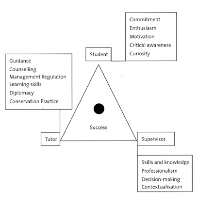 Critically, and more accurately recognising their input, it is the direct interaction with the individual, specialist supervisor that is likely to have most influence on the outcome of a student's course of study and the profession is probably one step removed from this intimate relationship, the wider, collective, picture filtering through the actions of individuals. And while the conservation profession impinges indirectly on our student experience through individual supervising conservators, the direct experience of supervising our students hopefully has benefits for the profession. In the relationship between students and the supervising conservator, the development is unlikely to be one-sided.