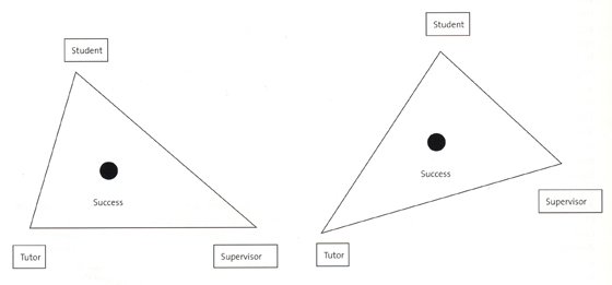 At any time the extent which each contributor delivers part of the experience to may change. As the student's enthusiasm wanes, it may be necessary for the others to offer more encouragement. Where the supervisor's particular element of skills or knowledge may be weak, others may be recruited to support this this. And where a tutor's professional expertise may lie in a field other than the student's specialism, it may require both the student and the supervisor to be more pro-active in defining suitable tasks and assignments. This triangular relationship is between people and, while regulation and professionalism are elements of the formal framework to ensure compliance with standards, the distance between the individuals will shift as external influences of health, employment, finance and other relationships intrude (Figure. 2).