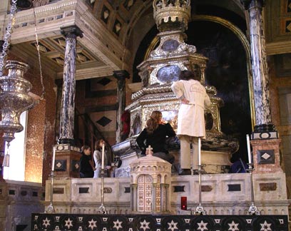 Figure 1: Conservators working on the copper paintings in the silver alterpiece at the Irish Convent of Nuns (click image for larger version)