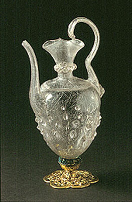 Figure 1: Glass ewer with gilt metal base (1809-1855), 17th century, Venetian or Netherlandish, in advanced state of decay (crizzled) (click image for larger version)