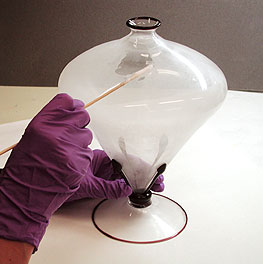 Figure 2: Vase by Tapio Wirkkala, Finland 1950-1969 (Circ. 438-1964), with early signs of glass decay (cloudy appearance), during cleaning. Photography by Fi Jordan (click image for larger version)