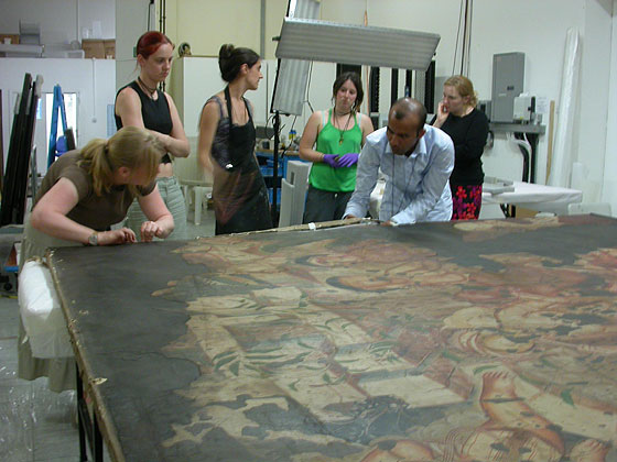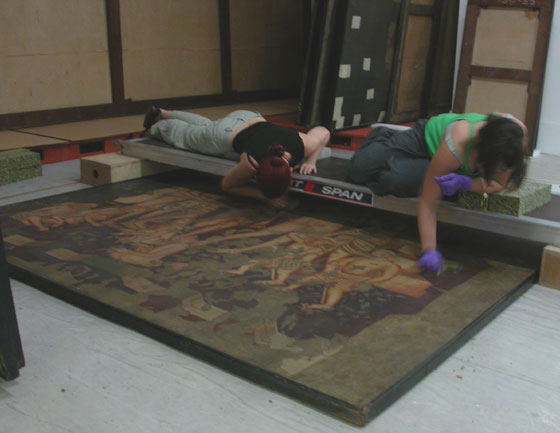 Figure 2. Students strip lining one of the paintings. Photograph by Nicola Costaras (click image for larger version)