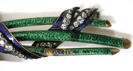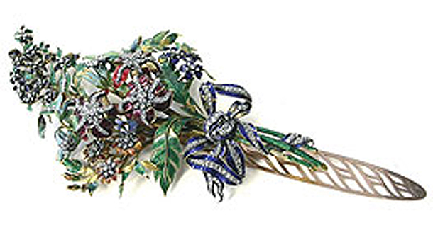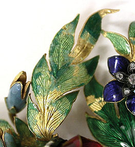 Rose-cut and brilliant-cut diamonds are set in silver and the collets riveted to the gold alloy. These sections in turn are attached by pressure fitting and by the use of thin gold wire. The sections have to be joined mechanically, as a heat joint, i.e. soldering, would damage the enamel.