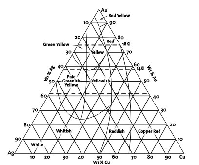Gold and silver are preferred for transparent and translucent enamels as they are reflective materials and do not oxidise readily beneath the enamel during firing. Fine gold is not suitable for enamelling due to its softness and low melting temperature.1 A gold alloy substrate used for enamelling may have been of 22, 18 or 14 carat, or anywhere in between, with silver and copper as additional components in the alloys. These metals are added because they ensure that the final alloy has a higher melting point and hardness than that of pure gold. Table 1 shows gold-silver-copper alloys and the resulting variations not only in the colour of the alloy but also in the colour and brilliancy of the enamels. The areas producing the best transparent colours are "Red Yellow", "Yellow", and "Yellowish".2