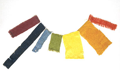 Among around 40,000 documents, in Chinese, Tibetan and other languages, and paintings, there were also a great number of long, narrow silk strips and small squares. These silk fragments show an incredible breadth of colours, from canary yellow through the clearest red to deepest indigo (Figure 1). The Dunhuang finds demonstrate a range of beautiful yet subtle damasks, vibrant polychrome pattern woven silks, and embroidered gauzes, clamp-resist dyed and painted silks. A number of complete and fragmented banners, canopies and altar valances give evidence of the importance of this shrine site as one of China's great Buddhist pilgrimage complexes.