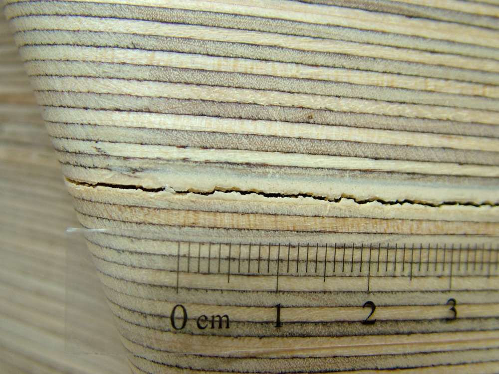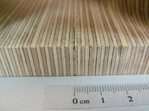 Plywood is manufactured by processing timber and is made of at least three layers of thin veneer. These veneers are orientated with the grain running at right angles to the adjacent layer and glued together with strong modern adhesives. This technique makes plywood very flexible and improves strength whilst reducing shrinkage, cracking and warping, in comparison to a non-manufactured timber. It is necessary to look into the manufacturing process of plywood to understand possible causes for the visible damage to the Cinderella table. Plywood is generally manufactured in large sheets. Layers of veneer are produced from logs of felled trees, which are debarked, heated and soaked to soften the wood. The log is then placed on a peeler lathe that rotates it horizontally with a full-width knife blade peeling an endless sheet of veneer from the spinning log. This peeling process causes a lot of tension in the wood and can cause small cracks throughout which can weaken the structure, but are normally filled with glue. For the Cinderella table, dark phenol-formaldehyde resin was used, but other adhesives are also commonly employed. The type of adhesive depends on the specific application of the finished plywood. When completed, the peeled veneer is cut to the desired dimensions, dried and an odd number of sheets are glued together with a hot press.