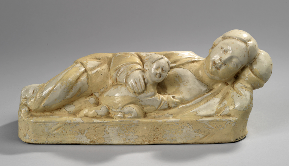 This ceramic pillow was bought by the Museum in 1911 from dealers S. M. Franck & Co., an importer of goods from the Near and Far East during this period. Regular dealings with this firm had been conducted since 1883. (3) The acquisition files indicate that large numbers of objects were being dug up from graves as a result of newly-built railway lines in China in the early years of the twentieth century. (4) Chinese burial wares, which were previously unknown in the West, were unearthed and removed by foreign engineers such as Johan Gunnar Andersson (1874-1960). (5) Collectors and museums in Britain began to acquire these wares through dealers. It therefore seems likely that these were the circumstances in which this object was found. According to archaeological evidence, ceramic pillows are still commonly retrieved from tombs. (6) As a result, it was previously assumed in Western scholarship that pillows were used only within the grave. Probably perceived to be uncomfortable, the need to lie relatively still upon a ceramic pillow made the argument for tomb use logical. Historian Robert Paine argued against this and suggested over fifty years ago that it is, above all, the subject matter of pillows which firmly established their original use for the living. (7) Indeed, a pillow played a significant role in both environments; it is even possible that they were consciously manufactured for both. The high volume of pillows found in tombs is the principle reason for their preservation and high survival rate; there are many examples of Chinese ceramic pillows in museums worldwide today.