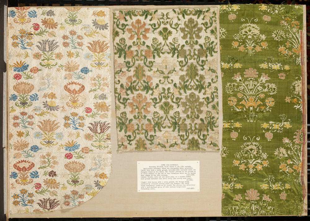 The majority of images in the Silvern Series are examples of flat pattern, mainly textiles, with a few tile panels and embossed leathers. There are only a handful of three dimensional items (such as a tall Persian vase). The Series contains many examples of woven silk brocades and damasks such as ‘number 37’ (fig. 3), which were mainly French, Italian and Turkish in origin. ‘Silvern Series number 38’ depicted a Turkish silk brocade based on ogee patterns, and also featuring pomegranate motifs. (54) There are numerous examples of lace panels, embroidered hangings, and Persian tile panels. Silver included a good selection of eighteenth-century French brocades, and a number of Spanish or Dutch embossed leathers (for example, 474-1869). His selection included a number of Italian velvets; not only the magnificent palmate designs used for altar hangings, but the more everyday textiles probably originally intended for garments. These small fragments of Italian velvets feature small sprig motifs, often set within a grid. These are not ‘show-stopping’ objects, but instead are examples of more ‘everyday’ designs with a more general application to modern manufactured goods.