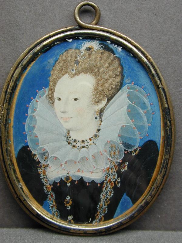 Miniature painters (or limners) prepared most of their tools and paints themselves. We know that Hilliard in particular was extremely interested in the quality of his materials, and in the purity of his pigments. This knowledge of materials and techniques was passed down from master to apprentice, and is reflected in the fact that Hilliard’s miniatures appear in relatively good condition today. Hillard is also remarkable in his use of three-dimensionality in the application of decorative elements to his works, particularly in the depiction of precious jewels. You can see this in the jewels in the necklace of ‘Portrait of an Unknown Woman’ above, and in detail in his early portrait of Elizabeth I, below. Painted in silver and gold, these jewels appear to shine in the light, and although it may not particularly apparent when looking at his miniatures in their lockets at a distance through glass cases at the museum, it is very obvious when examining his work up close – even more so when one examines this delicate brushwork under a microscope. Hilliard’s skill with a brush in painting at such a small scale is really something to behold.