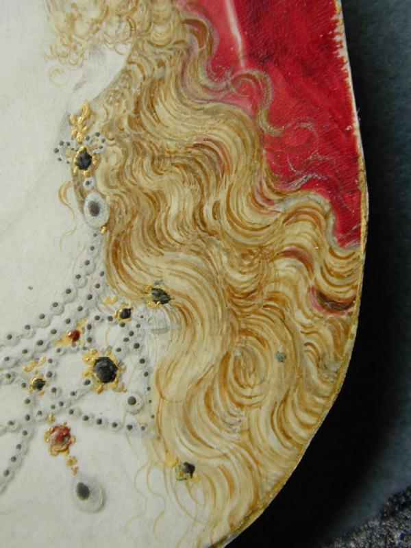 One way of rediscovering artists’ technique is through reconstruction. Alan, working with fellow conservator and artist, Timea Tillian, was able to determine how these jewels were created by following original treatises, and physically recreating the effects observed in Hilliard’s miniatures themselves. In the case of the rubies, a tiny circle of shell silver is painted onto the surface of the miniature to supply a reflective surface. Shell silver is made by pulverising silver leaf in honey to reduce it to a fine powder, then adding water and a plant gum binder (like gum Arabic) to create a silver paint that can be applied with a brush. It was pre-prepared for painting and typically kept in an mussel shell, hence its name. After this had dried, a tiny blob of coloured, melted turpentine resin is added using a hot needle (you can see this below on the left). Semi transparent, the resin allows the sheen of the silver to show through, giving it the appearance of a precious jewel. The jewel’s ‘setting’ was typically painted using shell gold (prepared in the same way as shell silver, described above). These tiny areas of gold were then burnished to a high sheen. Everything to do with miniature painting typically being on a very small scale, it was recommended that this was carried out using the tooth of a weasel.
