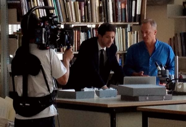A few weeks ago, the art historian and presenter James Fox (A History of Art in Three Colours, British Masters) came by the conservation department to film a segment for ‘A Very British Rennaissance‘, a new documentary series to be shown next year on BBC 2. He came to discuss the materials and methods used by the great English miniature painter, Nicholas Hilliard with the V&A’s portrait miniatures specialist, Alan Derbyshire.