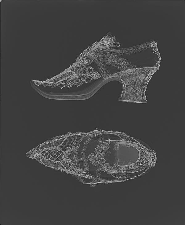 The beautiful embroidered 18th century shoes below have a built-up, platform sole. The X-ray reveals that the sole is padded with a soft felt-like material between the layers of leather giving the wearer an extra centimetre of height. Also, because metal objects are typically opaque to X-rays, in the image we are able to see the extent of the metal thread embroidery much more clearly.