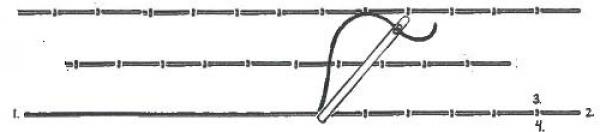 A type of conservation stitch was used to hold the loose threads in place and to realign the weave so that it lay as straight as possible. This is called laid couching and is one of the most common stitches used in textile conservation. It looks like this:
