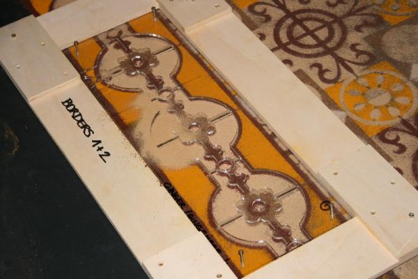 The stencils float above the surface of the floor on the points of screws so that they can be lifted up without disturbing the surrrounding areas: