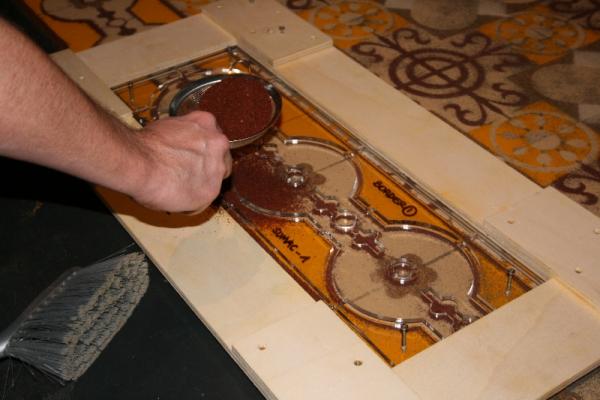Because the damage interrupts the entire pattern, several stencils are used in a particular order to restore the damaged area. Here Chris adds a layer of sumac followed by a layer of ginger: