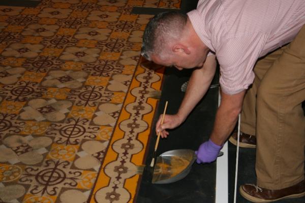 So this morning, armed with a set of Mareschal’s original stencils and some several very large containers of spices (we like to be prepared for any contingency), Conservator Chris Gingell carefully removed the damaged area with a brush, replacing the missing areas by applying new spices with a sieve through the artist’s stencils:
