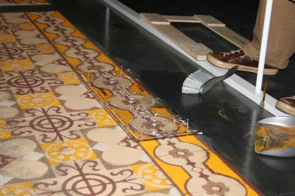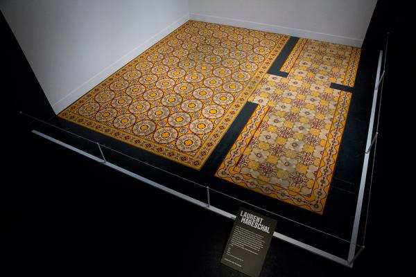 Mareschal is interested in the short lived nature of this work. He is happy for the spice floor to slowly fade over the duration of the exhibition. However with such a fragile work, we also expect that some damage will occur that does not come under the remit of the artist’s wishes, and when this happens it requires our attention. At first glance, the floor looks very similar to a ceramic tiled floor, and the fact that it isn’t is not immediately obvious just by looking at the work from behind its barrier. This has been an issue when the work has been installed at other venues, as he points out: