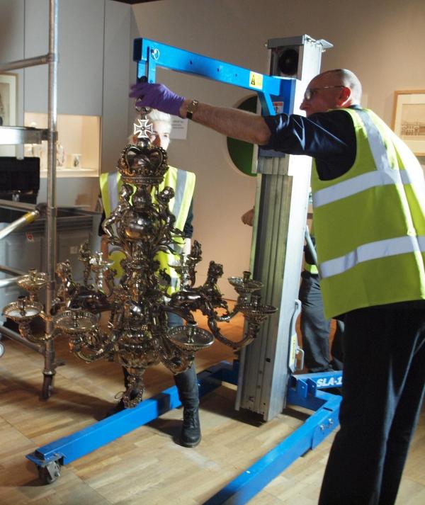 Every day the Scroll of Events (otherwise known as the Exhibition Schedule) is updated, and today I was especially interested to note the arrival of the show’s shiniest object, a magnificent silver chandelier. The chandelier (one of a set of five) was originally designed by William Kent for King George II’s court at Hanover in 1736-37. Today one chandelier is in the collection of the MFA in Boston, and another in the care of the National Trust at Anglesey Abbey. The latter arrived this morning, accompanied by a courier from the National Trust and a metalwork conservator, who meticulously checked the chandelier to ensure it hadn’t sustained any damage on its journey from Cambridgeshire: