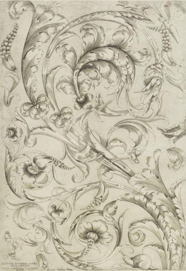 This exquisite design for a foliated scroll populated with insects is by the first woman engraver to sign her work, Diana Scultori (1547-1612). She was trained as an engraver by her father Giovanni Battista Scultori. Although it was common for daughters in artisan families to train in a craft, it was unusual that she used these skills to pursue a career. This print states that it is based on a drawing by Giovanni di Pietrasanta after the antique (‘BATTISTA DI PIETRA SANTA DALL ANTICHO’). Giovanni di Pietrasanta had collaborated in the early 1560s with her architect husband Francesco da Volterra (1535-1594). As a woman Diana Scultori was barred from the Drawing Academy of Rome and it is believed that she received little or no training in drawing. She therefore relied on colleagues and family to supply drawings that she could copy for her engravings.