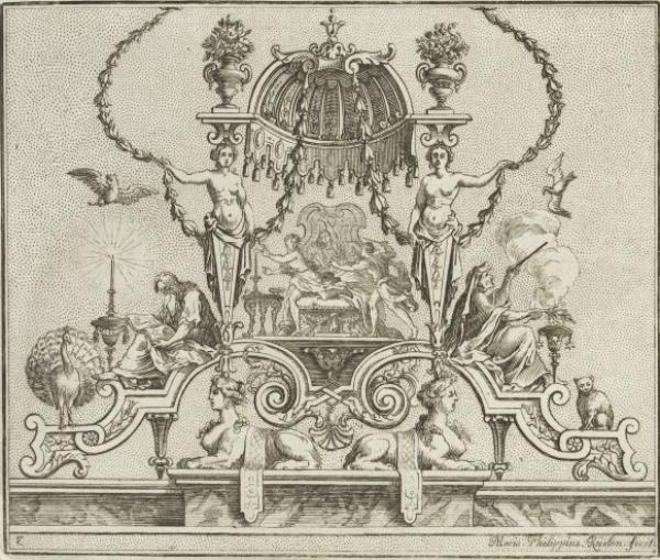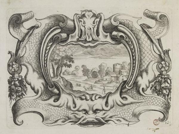 The plates for a suite of 12 designs for cartouches in the French auricular style by Daniel Rabel are listed in the inventory of François Langlois written on the event of Madeleine de Collemont’s marriage to Pierre Mariette II.