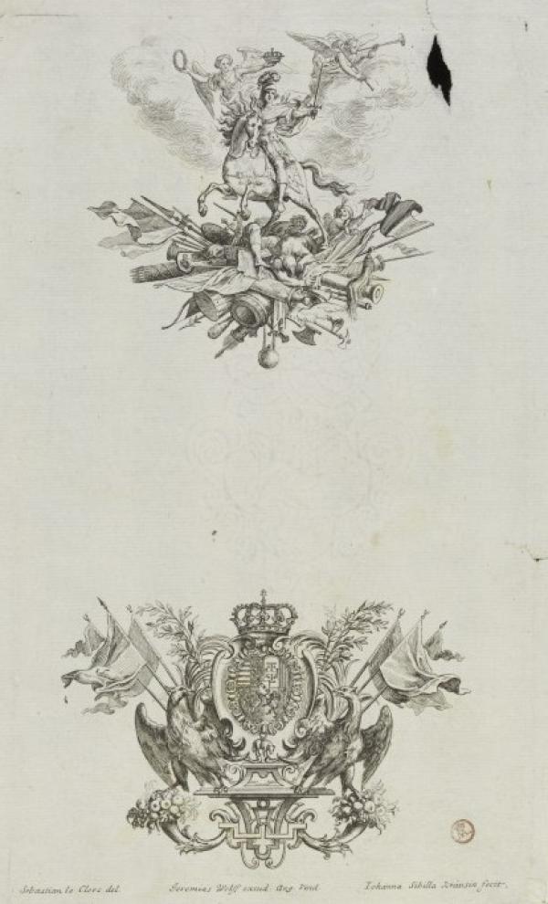 By the seventeenth century more women were making careers in printmaking. Like Diana Scultori, women printmakers and publishers often came from a family of engravers. This is the case with the Küsel family working in Augsuburg. Johanna Sibylla Küsel (c.1650-1717), like her father Melchior (1626-1683), worked as an engraver. After her marriage to the engraver Johann Ulrich Krauss she signed herself Johanna Sibilla Kraussin, as in this print from Les Actions glorieuses de S. A. S. Charles duc de Lorraine. Her younger sisters Maria Philippina Küsel (born 1676) and Maria Magdalene Küsel (active 1688-1692) also worked engravers.