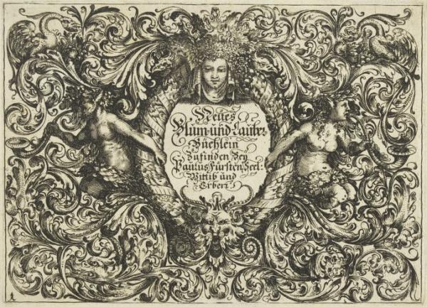 Some women continued their husband’s publishing business after being widowed. This title plate to a suite of 8 designs for panels of foliage and flowers entitled ‘Neüs Blum- und Laube- Büchlein Zufinden’ states that it was published by the widow and heirs of Paul Fürst in Nuremberg (‘Zufinden Beij Paulus Fürsten Seel: Wittib und Erbern’). It is likely that this edition dates to shortly after 1666, the year of Paulus Fürst’s death. Similarly in Paris the widow the print publisher François Langlois, Madeleine de Collemont (active 1647-1664) continued his business following his death in 1647. At her death in 1664 her stock of printing plates passed into the hands of the publisher Pierre Mariette II (1634-1714), whom she had married in 1654.