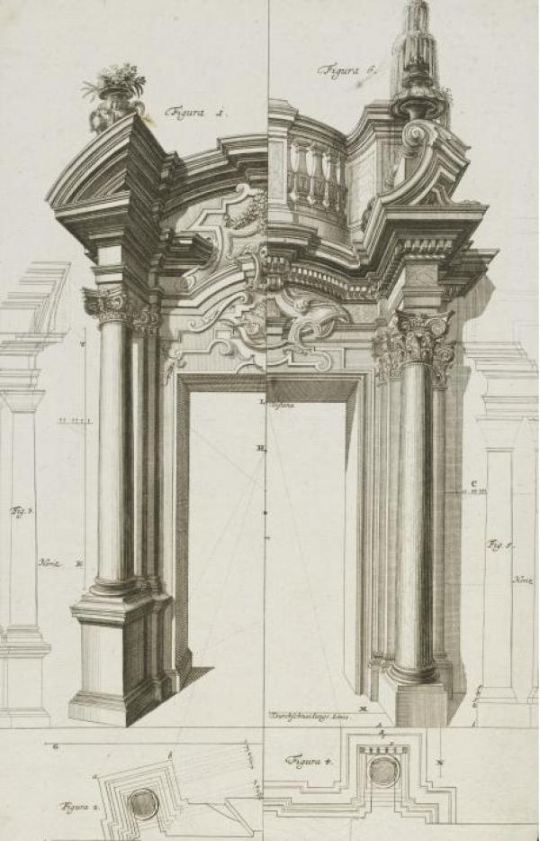 This print from Schübler’s first major text work, Perspectiva Pes Picturae, though it is not yet nearly as innovative as Schübler’s later works, is more revealing in terms of the artist’s architectural talents. Appearing in two parts between 1719 and 1720, Perspectiva was an oversized, luxurious work that seemed more akin to the ostentatious books of the previous century. It contained a written history of the studies of geometry and perspective, and was supplemented by a number of illustrations used by Schübler to demonstrate the ways in which these studies should be applied to architectural drawing, specifically. This print is a composite image of two elaborate gates, along with their respective plans and elevations. The design on the left side of the print, which he described as ‘a newly invented portal for the entrance of an orangery,’ drew on a similar gate designed by Leonhard Christoph Sturm. The design on the right, on the other hand, was original, and intended for the entrance to a grotto. Utilising both examples, Schübler hoped to prove that a return to the mathematical origins of proportion and perspective could resolve any number of architectural problems. In the subsequent text of Perspectiva Pes Picturae, he attempted to make these principles not only understandable, but also teachable to architects and builders.[13]