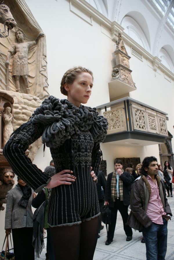 Fashion designer, Juliana Sissons, participated in the V&A’s Artist in Residency programme between July and December 2010. During this time Juliana used the V&A’s medieval and renaissance galleries for research and was particularly inspired by the armour collection and by images depicting armour within the many tapestries and sculpture. Sissons’ new collection on show today is of developmental knitted pieces inspired by the research, skills, exploration and textile experimentation gained during her residency. Like armour, these pieces can be worn separately or can be worn in conjunction with other items from the collection to make up whole outfits.