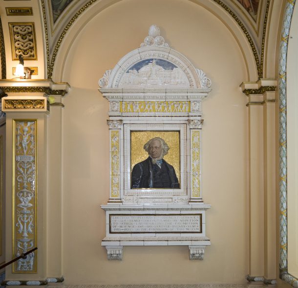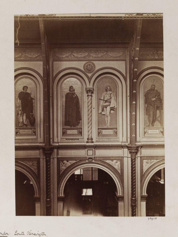 Not only did Italy have a rich tradition of mosaic decoration, it was also leading the way in its European revival. This was spurred by Antonio Salviati, a former lawyer who had made it his life’s mission to reinvigorate the craft in Venice. Salviati established his first workshop in 1859. A year later, he met Layard, who became the firm’s champion and subsequently one of its British shareholders. The relationship with Layard proved extremely beneficial for Salviati, leading to several high-profile commissions, such as the Royal Mausoleum at Frogmore and the Albert Memorial. Salviati was also involved in producing mosaics for what became known as the ‘Kensington Valhalla’ – a series of portraits of celebrated artists commissioned by Cole between 1862 and 1871 to decorate the South Court of the Museum.