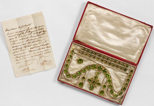 The V&A has acquired a rare set of peridot gems mounted in gold by the royal jeweller, Rundell, Bridge & Rundell in 1816, thanks to the generosity of private donors.