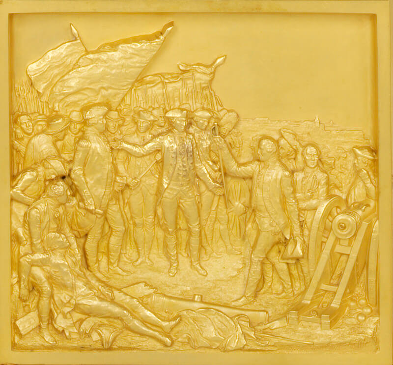 Some of Lafayette’s greatest achievements are depicted on the base of the vase, surrounded by swags of fruit and oversized figures of Liberty, Equality, Strength, and Freedom. Underneath these scenes of triumph are the images of the French cockerel and the American eagle. One of the commemorative scenes illustrates the British general Cornwallis offering his sword to George Washington as a sign of surrender. This key moment in the American Revolutionary Wars occurred at the end of the Battle of Yorktown on 19th October 1781, in which both Lafayette and Hamilton played crucial roles. Although Hamilton is not depicted on the vase, he served in Lafayette’s Division as a commander of a light infantry battalion, leading the attack on the British at Yorktown. Following their defeat at this battle, the British were prompted to start negotiating an end to the conflict.