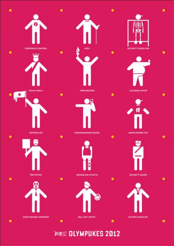 In a second project for the London Games Barnbrook’s Virus Fonts has released a new 2012 version of the Olympukes – a subversive reworking of the Olympic pictograms. It was at the last London Games in 1948 that Olympic pictograms were used for the first time and they went on to become one of the most revered infographics commissions in the business – a project that seemed to embody Olympic aspirations of universalism. The concept behind the Olympukes is that while official sets of Olympic pictograms create the illusion of being a clear and neutral system for understanding the scope of the Games, they fail in honestly representing the nature of the Olympics today. The Olympukes are a witty, iconoclastic commentary – but one based on careful research into some of the key stories and controversies of the current Games. Available opensource they provide people with a font they can use to describe London 2012 in all its complexity and contradictions.