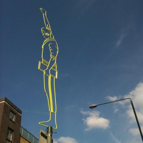 On top of a road sign near Brick Lane in London last week an unofficial street art tribute was erected to Tommie Smith – one of two black American athletes who famously used an Olympic podium at the Mexico City Games in 1968 to stage a demonstration against racial discrimination in the United States. As the American national anthem played, Smith and John Carlos (gold and bronze medallists in the 200m respectively) silently made the black power salute – creating an iconic image of dignified protest that was broadcast around the globe. Capturing the media attention honed-in on the Olympics, Smith and Carlos got a message out into the world that cut across the official narrative of the Games. The sculpture of Tommie Smith appearing in East London is a poignant reminder of a historic moment of civil rights protest (the photographer who took the image below described how encountering it raised goosebumps). As an unsanctioned piece of art on the streets of the Olympic host city it is also an example of current visual interventions in the Games – of which more below.