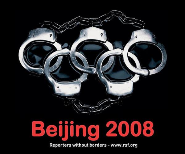 In the run up to the Beijing 2008 Games protests focussed on human rights and press freedom in China. Paris-based organisation Reporters Without Borders staged protests around the world and their ‘Beijing 2008’ graphic showing the Olympic rings as handcuffs was seen on posters, t-shirts and banners. It was even smuggled into the Olympic flame-lighting ceremony in Olympia and unfurled before the press cameras.