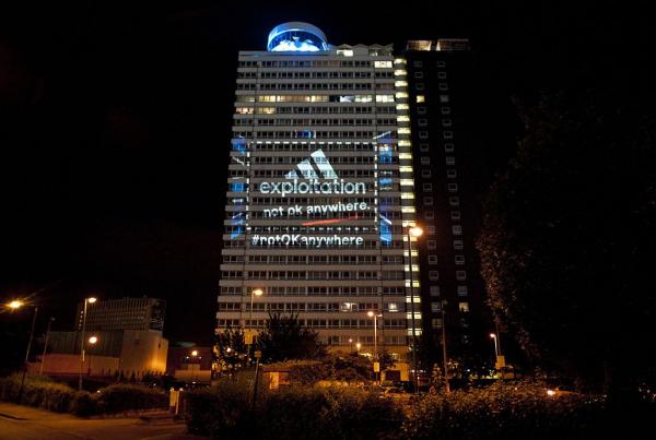 Olympic sponsors have been a target. Environmental activist group Climate Rush have taken British Airways to task for their ‘Home Advantage’ campaign (which magnanimously appears to encourage Britons to avoid flying and stay at home to support the Games) by changing the words on posters from ‘Support Team GB’ to ‘Support Team Climate’. A series of spoof MacDonald’s posters have been fly posted around the East End in which images of obesity are seemingly endorsed by 2012 branding. The War on Want pressure group, meanwhile, projected a 65ft image onto a tower block overlooking the Olympic Park, combining the text ‘exploitation – not OK here, not OK anywhere’ with the logo of London 2012’s official sportswear partner, Adidas, in reference to allegations of sweatshop labour. It was timed to be seen by visitors leaving the stadium after watching Usain Bolt win the men’s 200m. For a round up of protest commentary on London 2012 sponsors and a selection of subversive Olympic street art, see spoof newspaper ‘London Late – the Big Money Games’. The Occupied Times has also produced issues themed around the Olympics.