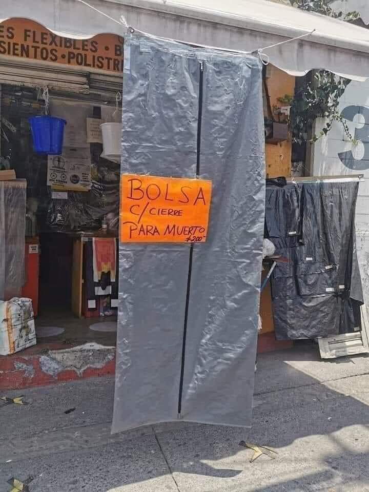 Meanwhile, body bags hanging up for sale in Mexico City’s bodegas appear on social media, an indication of the do-it-yourself approach to family mortality forced upon large numbers of the poor. In a megalopolis with a public healthcare system struggling to cope, makeshift solutions to self-protection and the unofficial organisation of urban circulation appear more frequently in photographs.