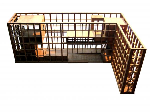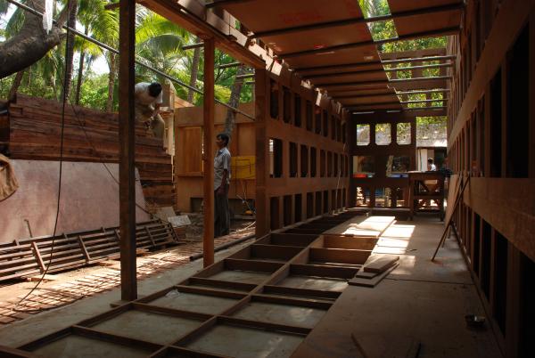 The image above shows a large-scale model which the Studio Mumbai team developed as a proof-of-concept. The photograph below depicts the full-scale version being assembled, with just the wooden frame exposed, before the plaster panels are applied.
