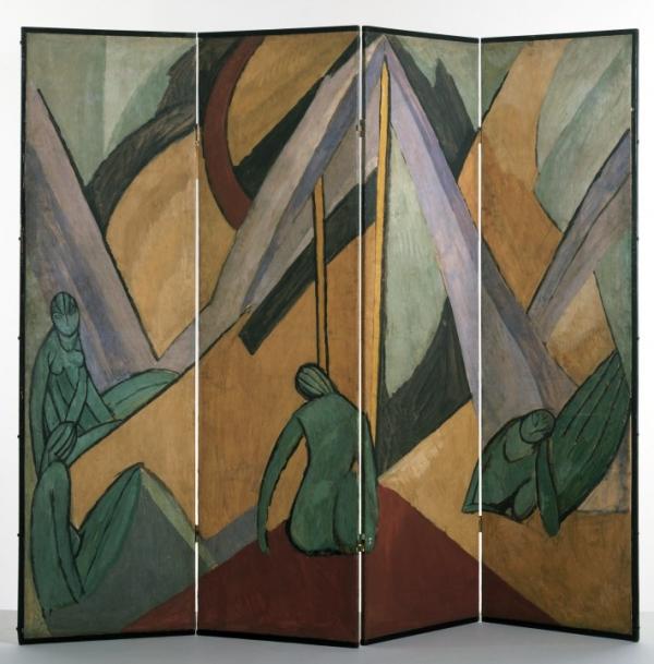 The Omega Workshops (founded in 1913) are often criticized as a hothouse environment, lacking the radical social vision of the Russian Constructivists (see my previous post Russian Arc) or the Bauhaus. But as the historian Christopher Reed shows in his brilliant book Bloomsbury Rooms, this was one moment where life and artistic ideals were intermingled in many and complicated ways. Under the leadership of art critic Roger Fry – one of the first British observers to really understand the Postimpressionist art then being made in Paris – a group of painters and sculptors including Duncan Grant and Vanessa Bell played at design. Their objective was to create a truly ‘non-traditional’ domstic interior, complete with textiles, ceramics, furniture, and other wares. Their aesthetic was basically expressionist. So the key objective for the Omega designers was to retain the freshness of touch that they could achieve in a handpainted object like the Japanese-style screen to the left, with its obvious indebtedness to Matisse. Notice in the detail of the screen below how they painted over the sides of the panels, and right across the hinges.