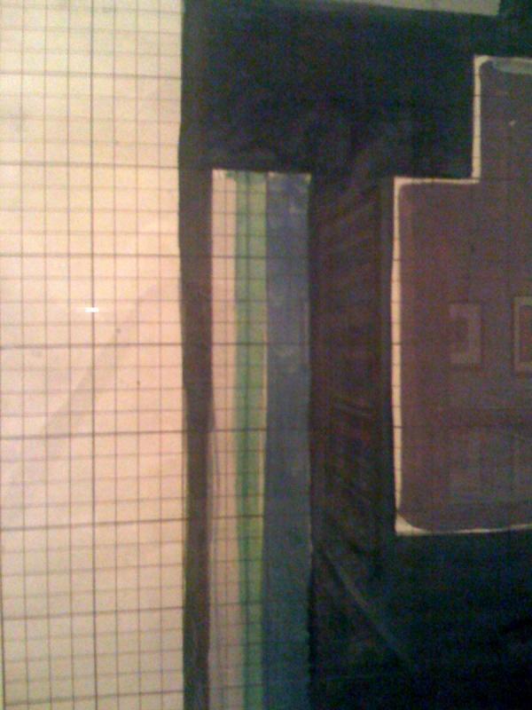 How to retain this sense of immediacy in a design for production, though? Textiles are a particularly interesting problem, because their grid-based construction of interwoven warp and weft threads lends itself to rectilinear designs but not to wild gestural composition. It’s almost funny to see the free-spirited Omega designers trying to use graph paper when planning out their textiles. Here’s an Omega drawing for a rug and a detail – notice how the blue line just wanders aimlessly off the grid.