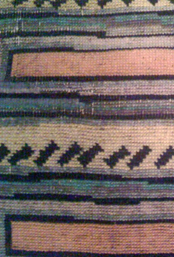 One obvious way to escape the grid in a textile is to paint or print the image on to the cloth, rather than weave it in. One example of this approach in the show was Vanessa White’s printed linen ‘White,’ which features blotches of colour scattered willfully across the surface, in no consistent relation to the overprinted linear design (which itself has a hand-drawn quality, thanks to the use of a stencil technique). In the detail to the left, a stray, tiny drop of red testifies to the speed with which the textile was created. But it’s in a woven textile like a carpet that you can really get a sense of Omega’s complicated relationship to the grid –