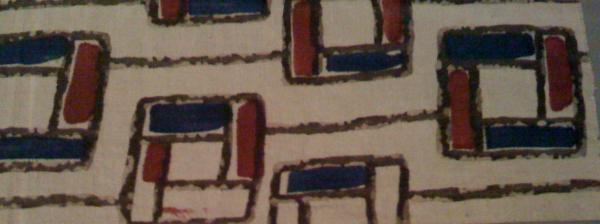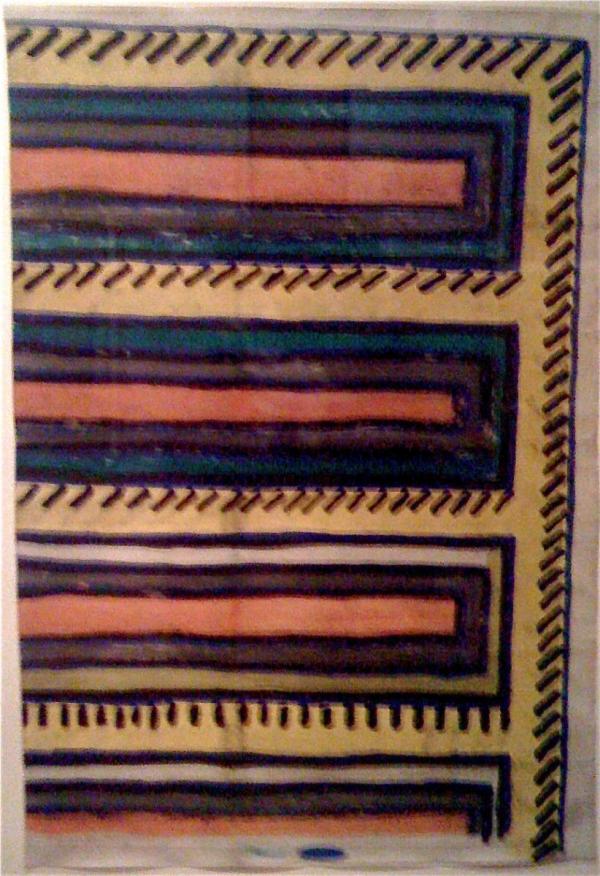 which was, for them, both a geometric structure in which to play, and a constraint on the expressionist gesture. The African-influenced carpet design at right was created by Duncan Grant for the Ideal Home Exhibition held at Olympia in 1913. It shows only one-fourth of the whole pattern (on the same principle discussed in my blog post Game of Two Halves, it was replicated for each corner of the final carpet). For the manufacturer of the carpet, it presented an obvious problem: how do you weave a textile that has the brushy quality of the black lines and hatch-marks in the drawing, which give it so much life and energy? The ingenious answer arrived at by Grant in conjuncton with the weavers at the Royal Wilton Carpet Factory (who probably made the carpet) is visible in the details below of the drawing and the finshed rug. As you can see, the draftsmanship of the sketch is conveyed in the textile through a series of ‘steps’ in each black woven line. As Fry wrote of the (unidentified) weaver, ‘he has taken a theme of almost daring simplicity, but not relying only on the broken quality of the knotted surface of the rug, he has deliberately broken his rectilinear by small steps up and down; he has also made his shading sometimes perpendicular and sometimes diagonal.’