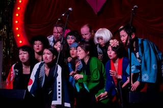 Frank Chickens, a legendary Japanese punk pop performance group, were founded in London in 1982 as a duo with Kazuko Hohki and Kazumi Taguchi, but the group has now expanded to more than 20 members.