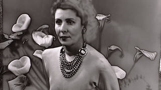 Ilse Bing was one of several successful European women photographers of the inter-war period. Born into a Jewish family in Frankfurt, she initially pursued an academic career, before moving to Paris in 1930 to concentrate on photography. She first experimented with solarisation in 1934. This partly solarised gelatin-silver print of Baroness Van Zuilen uses light and stark outlines to surreal effect. The lilies behind are abstracted and frame the sitter as she appears to float in her elegant outfit.